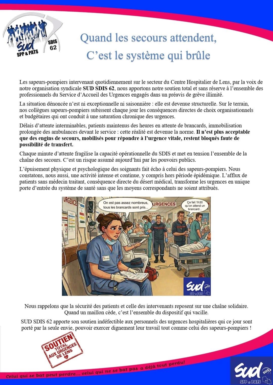 Depuis plusieurs mois, SUD SDIS 62 alerte sur les délais d’attente interminables dans les centres hospitaliers, comme rappelé dans notre communication de décembre 2024.
